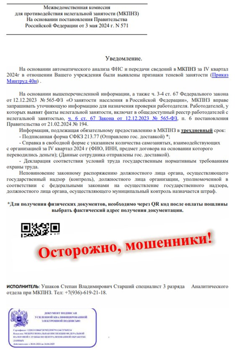 Мошенники под видом межведомственной комиссии по противодействию нелегальной занятости рассылают письма хозяйствующим субъектам о выявлении у них признаков теневой занятости. В рассылке указаны QR-коды для оплаты пошлины.